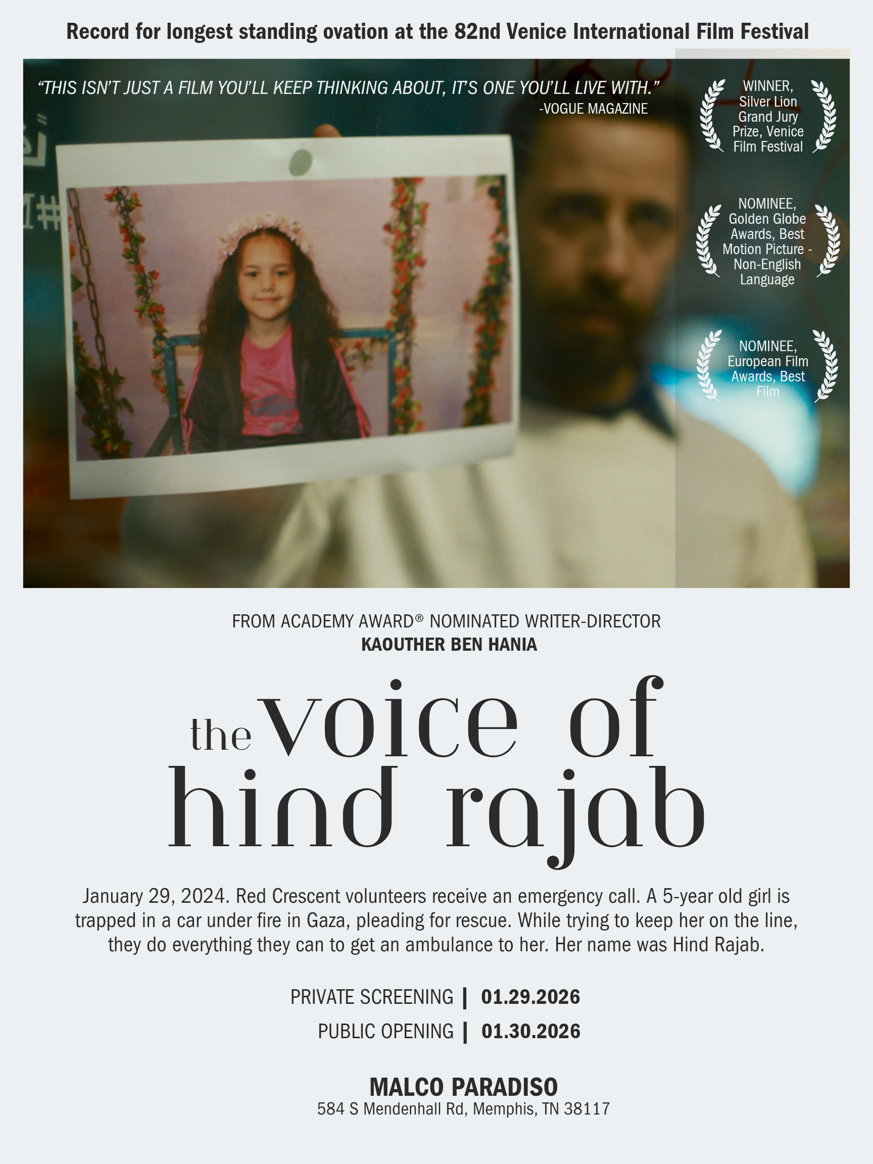The Greater Memphis Muslim Network (GMMN, a collaboration of pillar Muslim organizations in the Mid-South) has secured a private pre-screening of the critically acclaimed 2025 movie, The Voice Of Hind Rajab. We cordially invite you to experience it.